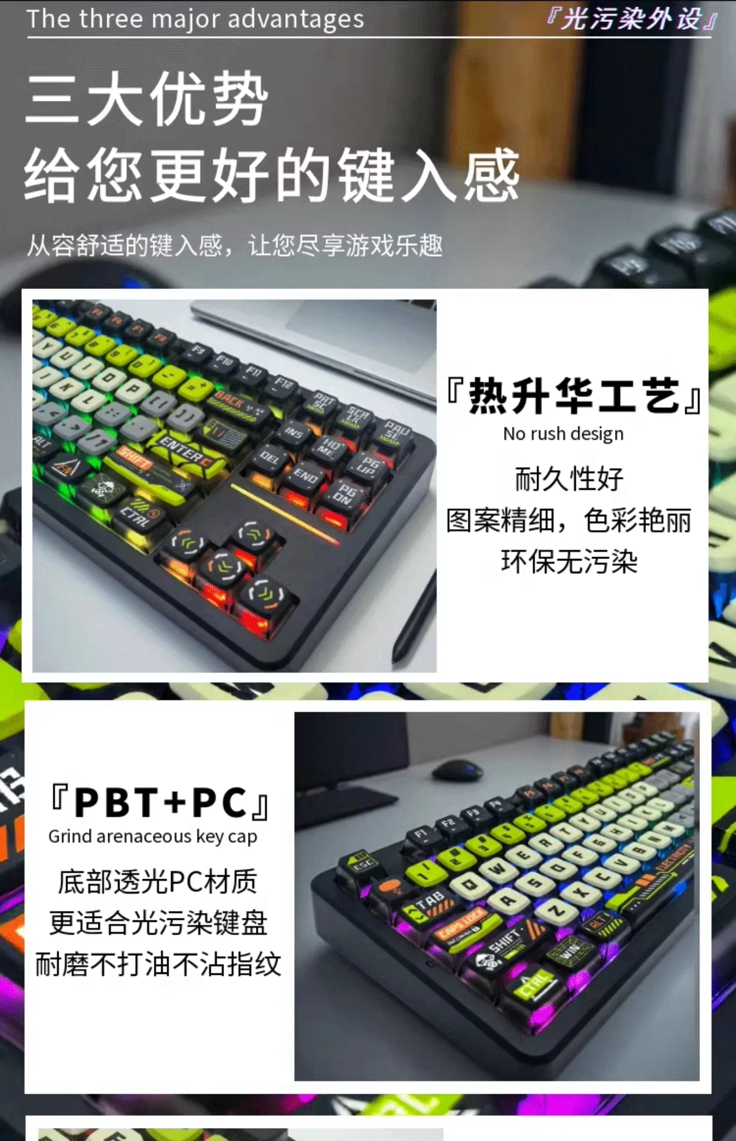 1.O estilo refinado traz uma nova experiência.As teclas são feitas de materiais de alta qualidade, adequadas para jogos intensivos e podem produzir efeitos de pressionamento de tecla satisfatórios e resistentes.