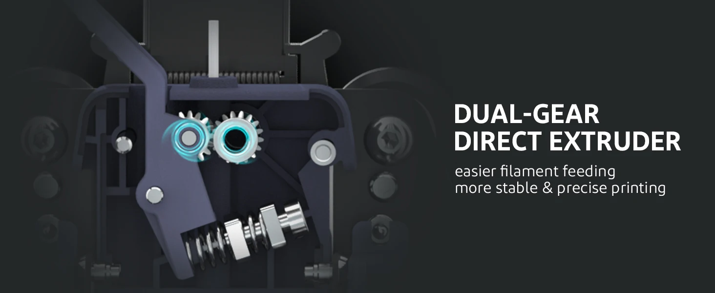 ?Dual-Gear Direct Extruder?The new dual-gear direct drive extruder is made of SUS303 high-quality stainless steel with a 3:1 reduction ratio and stronger extrusion force for smoother filament feeding and more stable & accurate printing, which greatly reduces nozzle clogging and under-extrusion issues, printing effect is better than Bowden extruder. Compatible with multiple filaments such as PLA, TPU, PETG, and ABS.