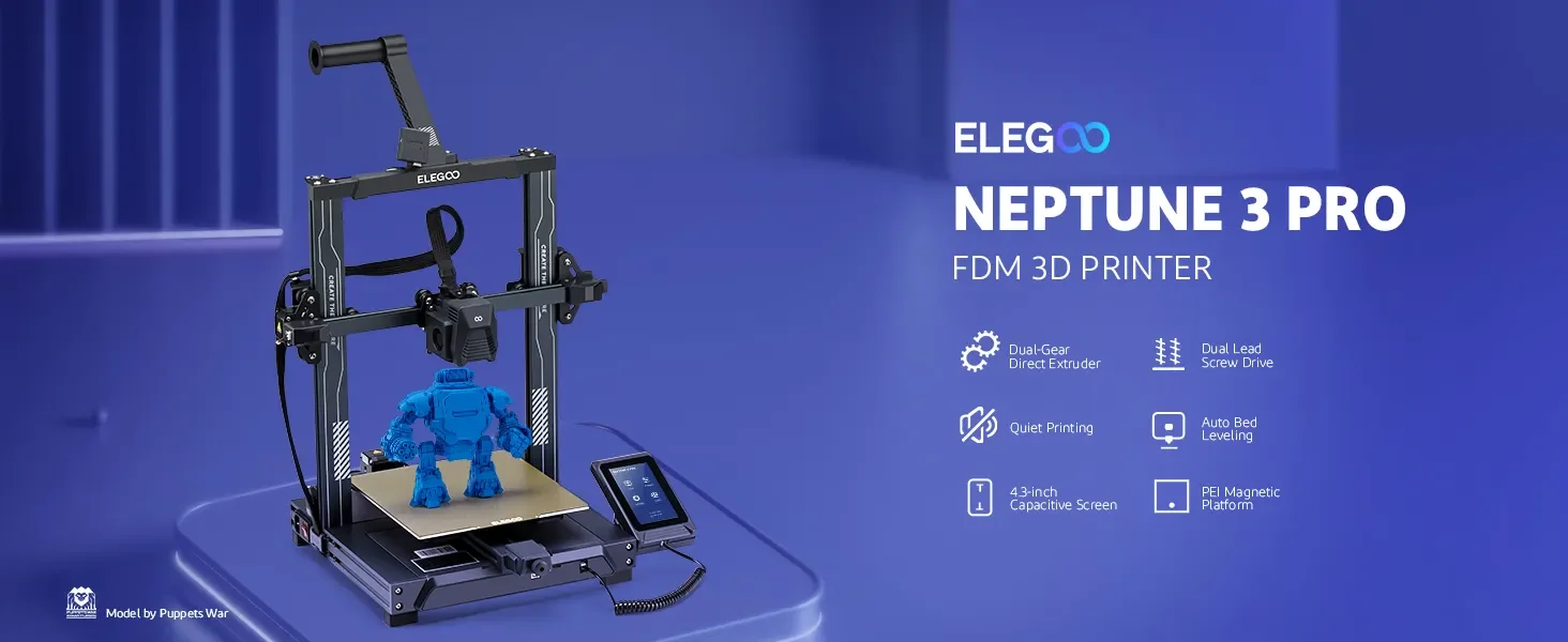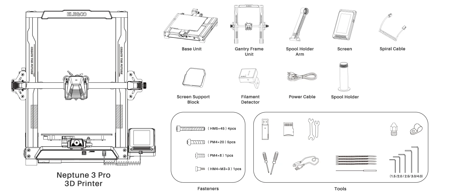 ?Overview of Neptune 3 Pro?225*225*280mm printing size can meet the needs of most users. With an STM32 motherboard, all axes of ELEGOO Neptune 3 Pro are driven by silent stepper motors for quieter and more precise movement during printing, which reduces the noise as low as 47-48dB. The easy-to-setup printer comes with the main components pre-assembled, as well as a complete tool kit for quick installation.