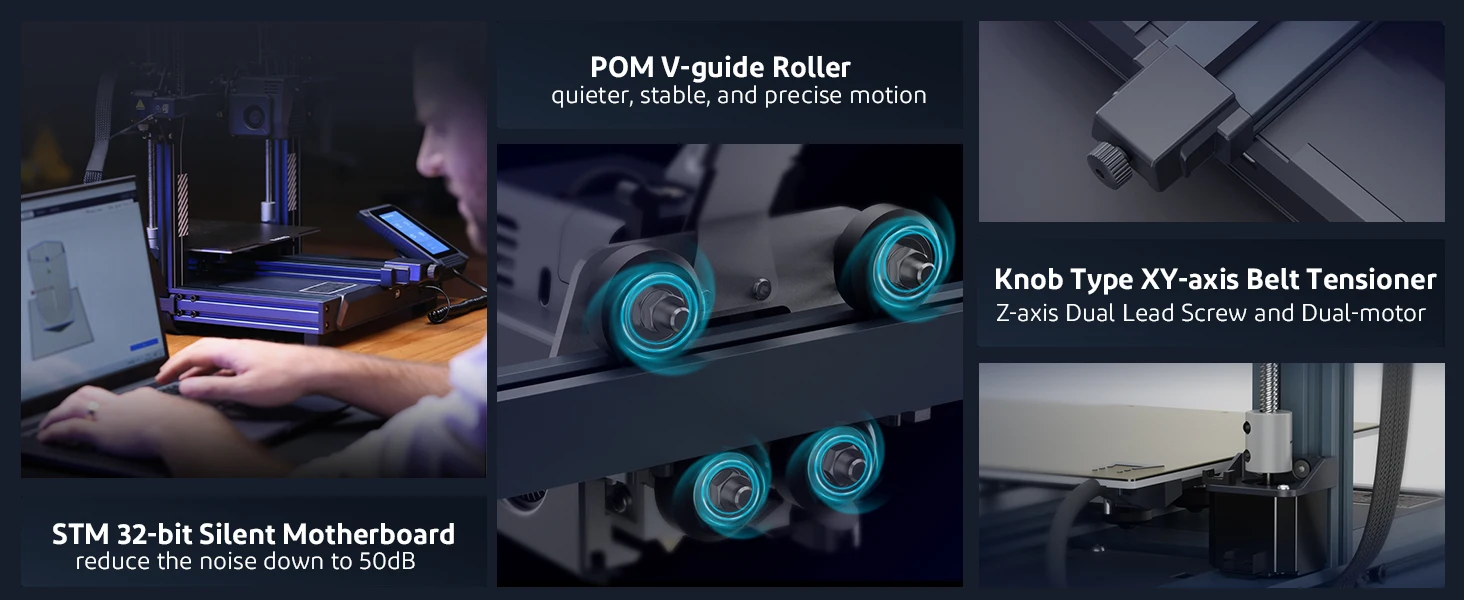 The whole machine adopts STM 32-bit motherboard silent drivers and a more reasonable nozzle heat dissipation structure, reducing the noise down to 50db, like a person's whisper. Wear resistance POM V-slot wheels move quietly, smoothly, and accurately.