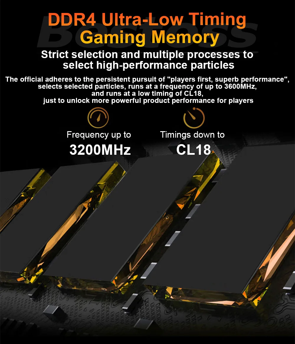 Observação: este módulo de memória RGB Bestoss requer que sua placa-mãe suporte o overclocking para atingir uma frequência de 3200 MHz. Se sua placa-mãe não suportar overclocking, a frequência será de 2.400 MHz.